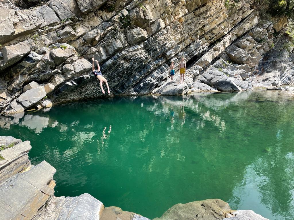 Hier kann man schwimmen, springen, schaukeln und durchtauchen. Das Ufer besteht aus rundgespülten Schieferfelsen, die in der Sonne wunderbar warm werden und uns als bequeme Liegefläche dienen, während ein laues Lüftchen stehts für eine äußerst angenehme Temperatur sorgt. Es ist erforderlich, ein bisschen zu klettern!
